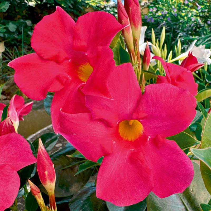 Der Fototeil der Mandevilla-Sorten ist nach Wuchstypen gegliedert. Detaillierte Hinweise zur Verwendung diverser Mandevilla-Sorten finden Sie im PDF „Mandevilla Kollektion“. Hinweise zu Standort und Pflege von Mandevillas finden Sie in der entsprechenden Rubrik. Wenn Sie sich über die Produktion von Mandevilla-Pflanzen informieren möchten, finden Sie diese auf unserer Unternehmens-Website. Ebenfalls finden Sie dort Bilder von den Verkaufsformen der Mandevilla-Pflanzen.